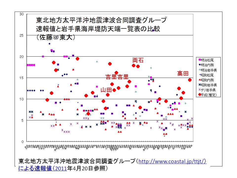 両石湾,大槌湾ともに壊滅的で,大槌湾では釜石市側も大槌町側も自衛隊や消防 等による捜索を含む活動がまだまだ実施されている様子でしたので,そ のよう な場所を避け,迷惑のかからないと判断された場所で実施しました.ですので調 査点は少数に留まっております.両石湾にはゲートのある巨大な 防波堤があり ますが,釜石(港付近の浸水高で7~9m程度)よりもかなり大きな値が出ていま す.大槌湾には津波防波堤はないと理解しています が,12m程度の値で,これも 釜石よりかなり高い値です.海洋大・東大チームの陸前高田では海岸付近で確か 15m程度だったと思いますが,これら を見ると釜石が相対的にはかなり低い値と なっており,やはり湾口の津波防波堤が効いているのではないかと推察しており ます.